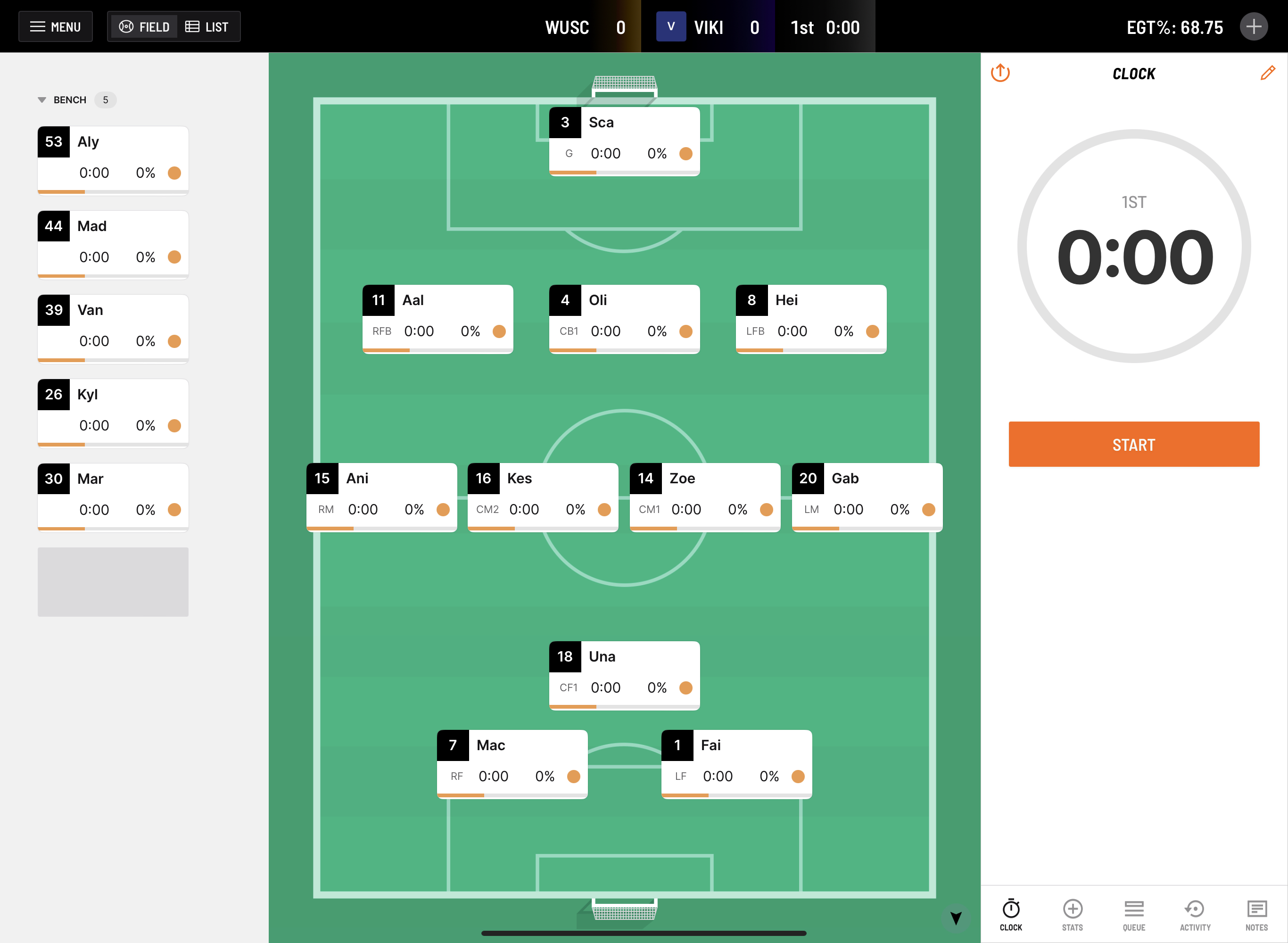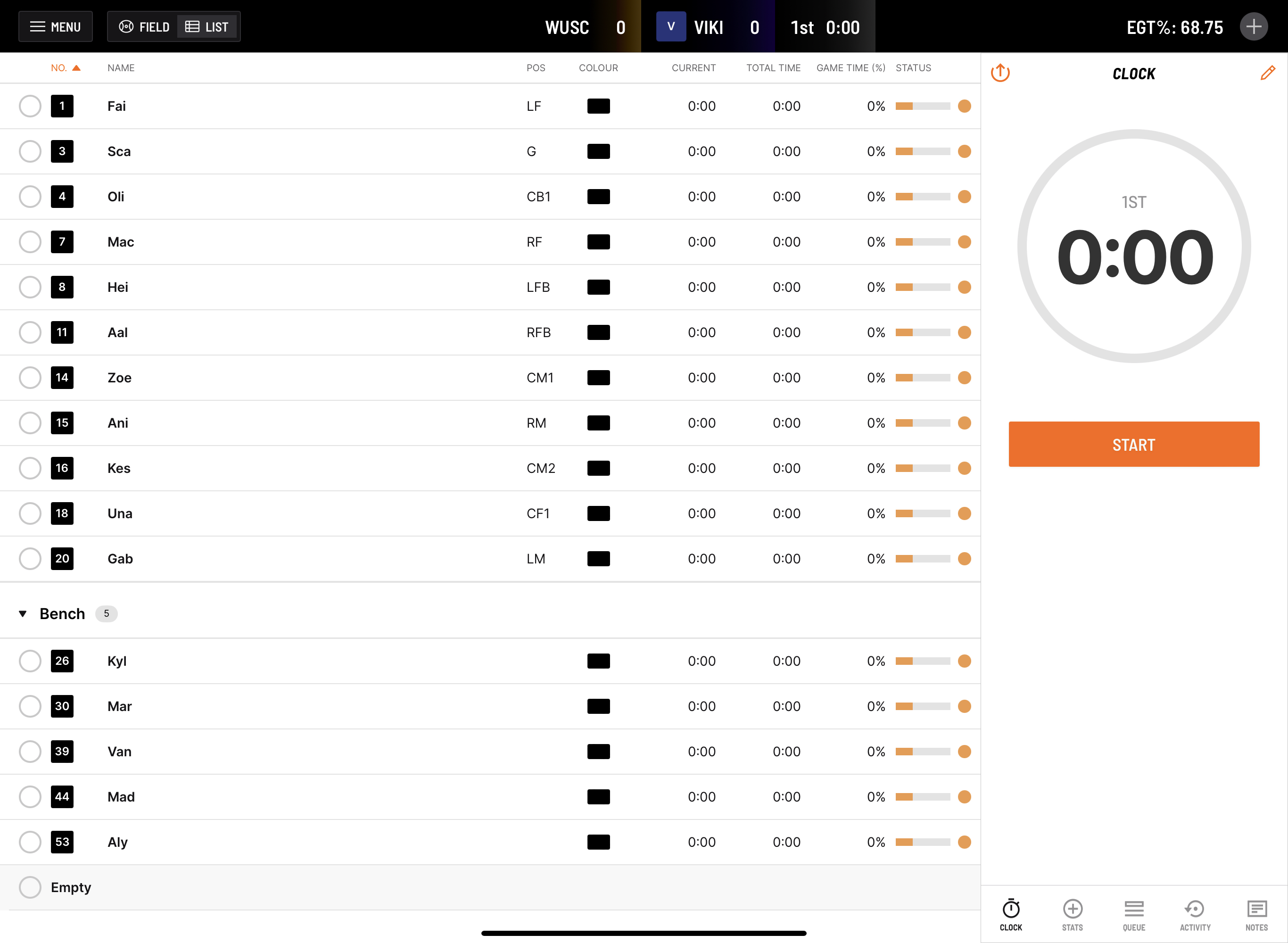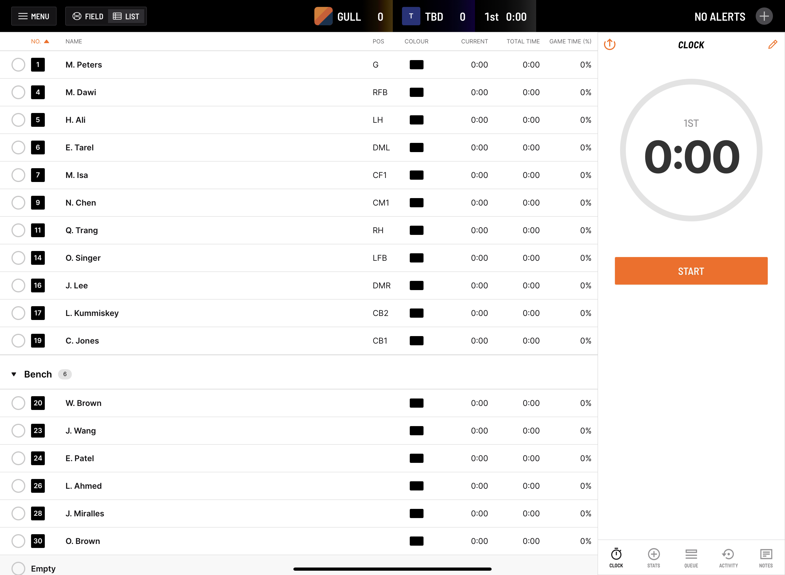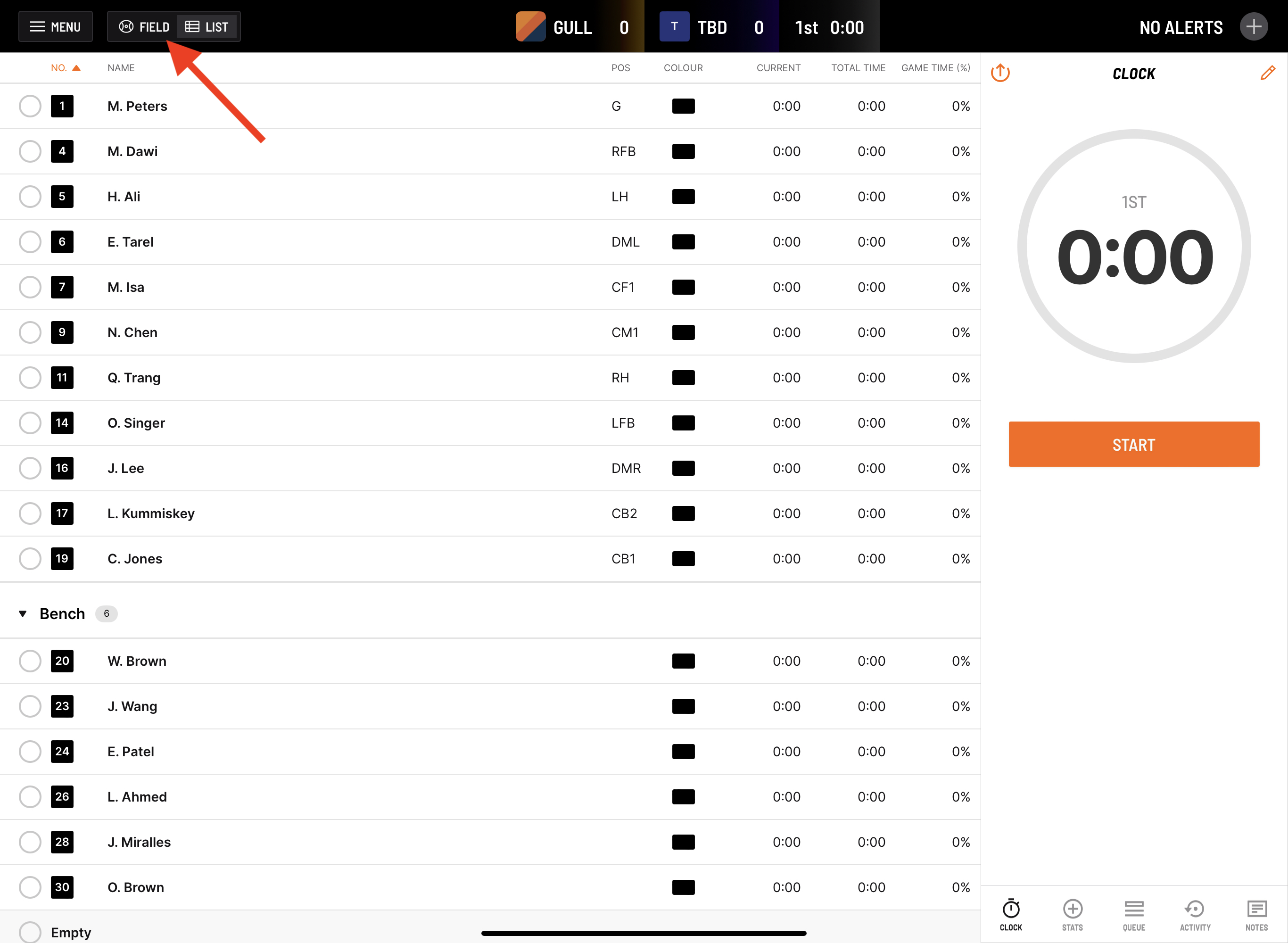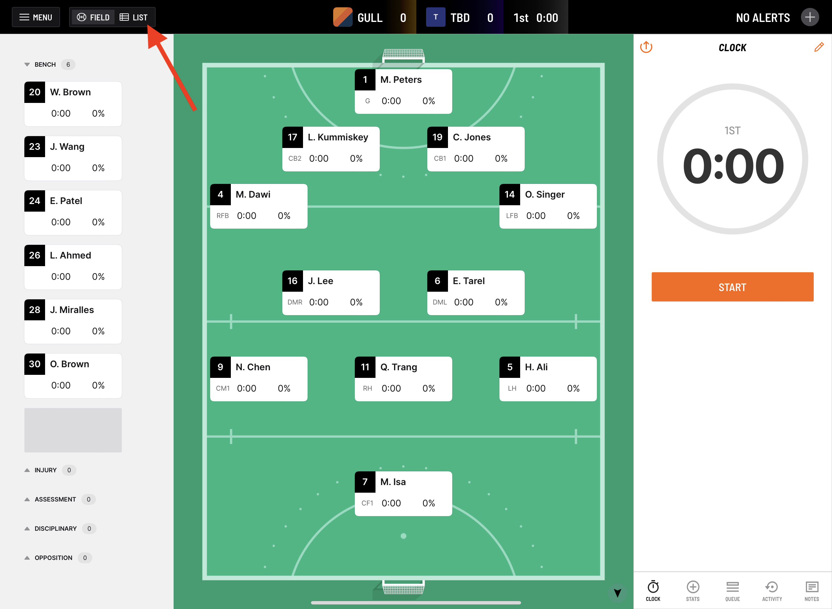 When in a game, users can elect to view the players on their sport's playing surface or in a list.