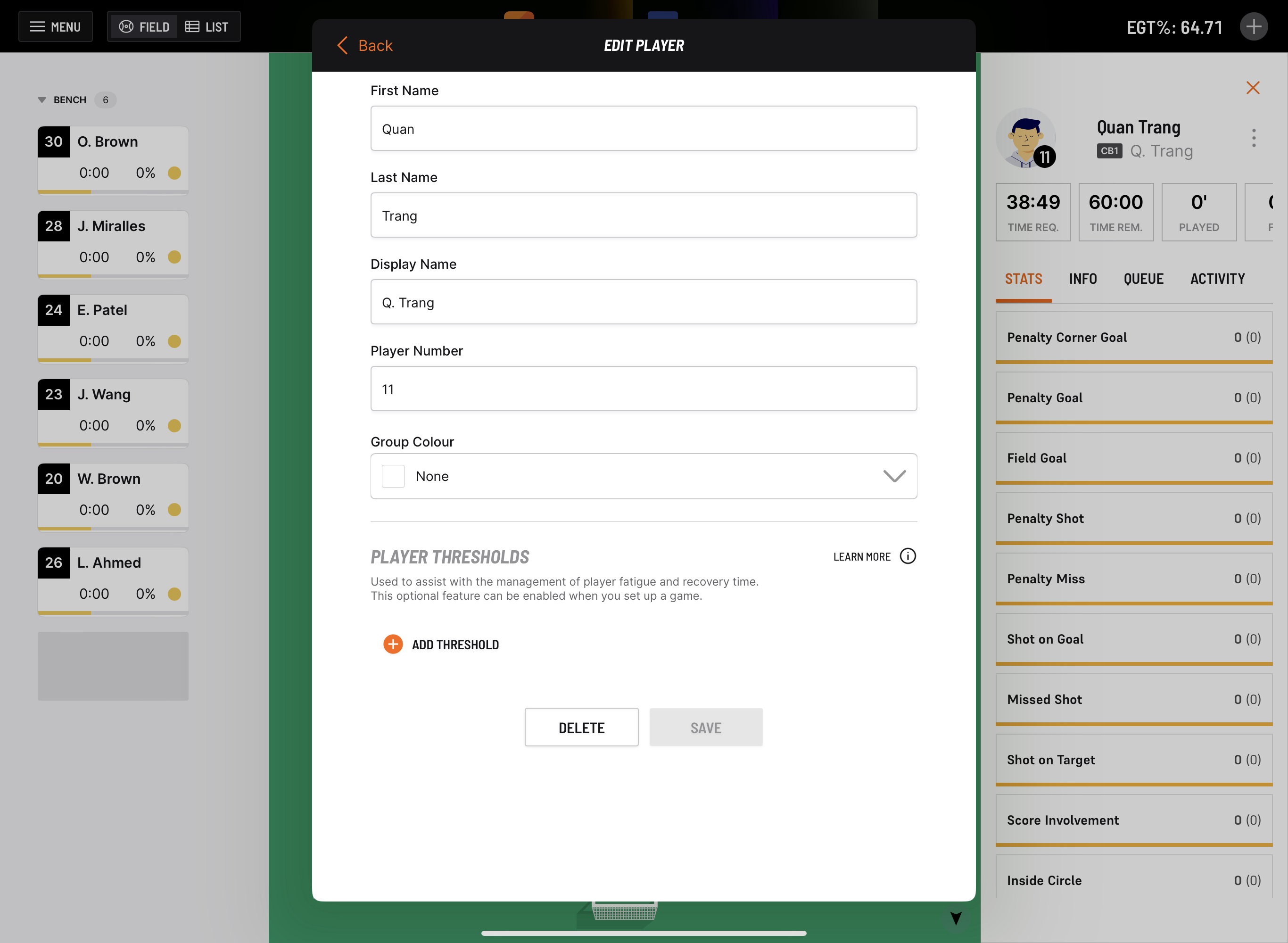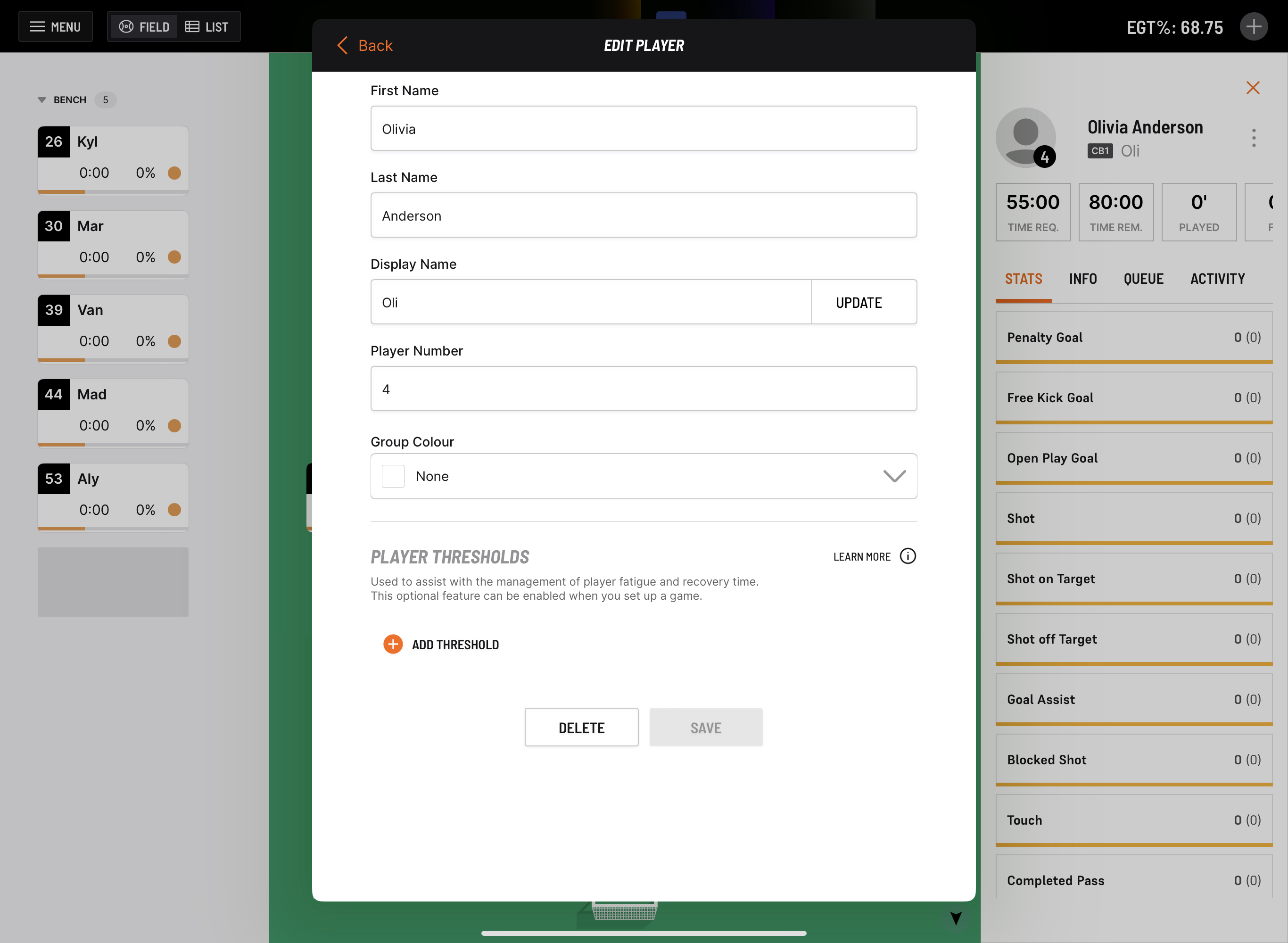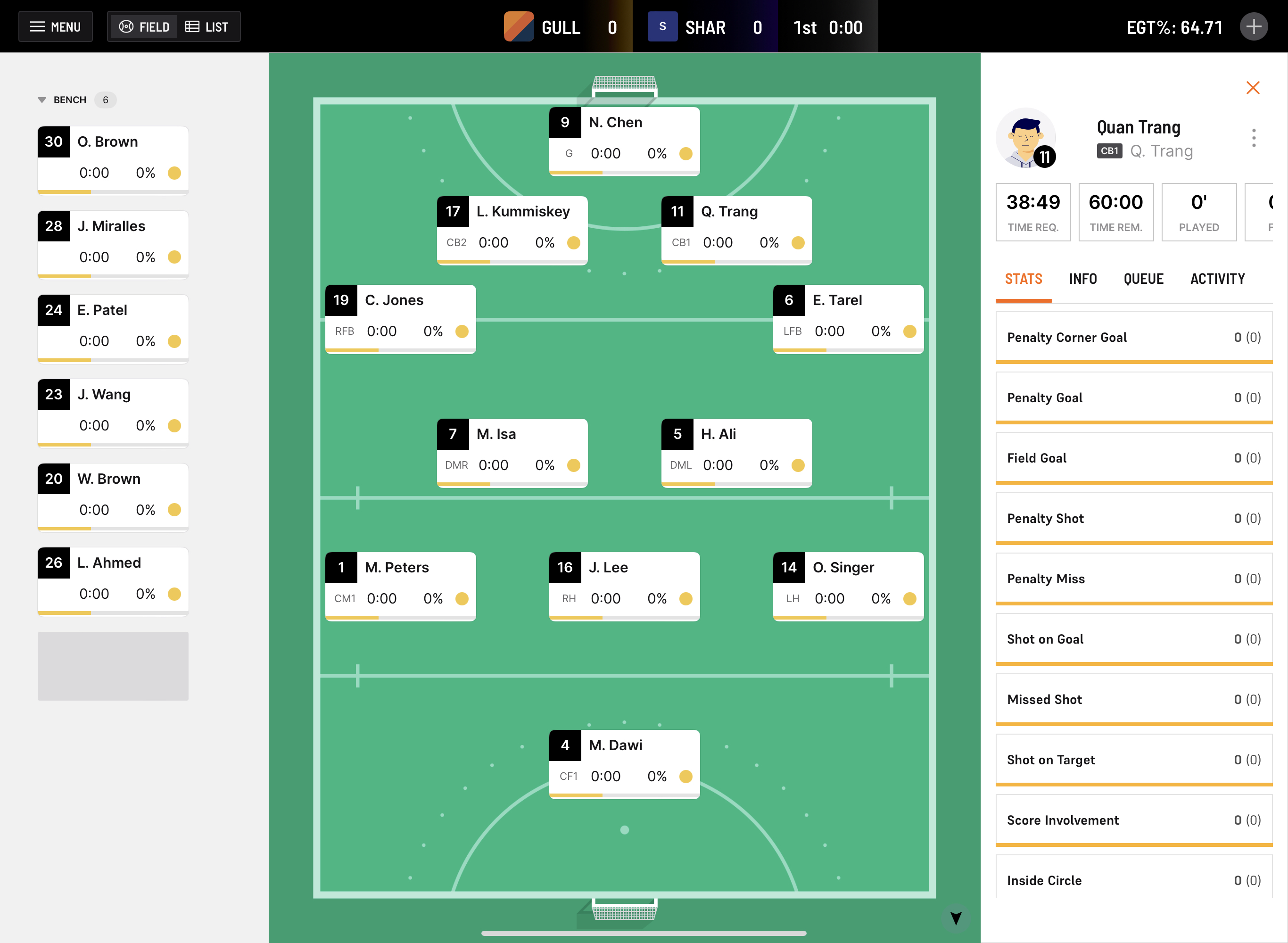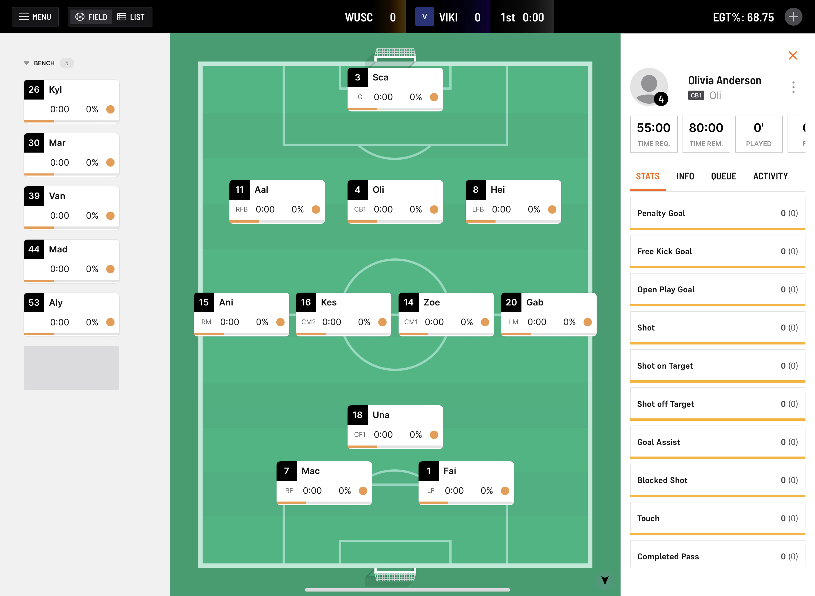 Colour coding allows the grouping of players for sorting data and making player substitutions/rotations easier.